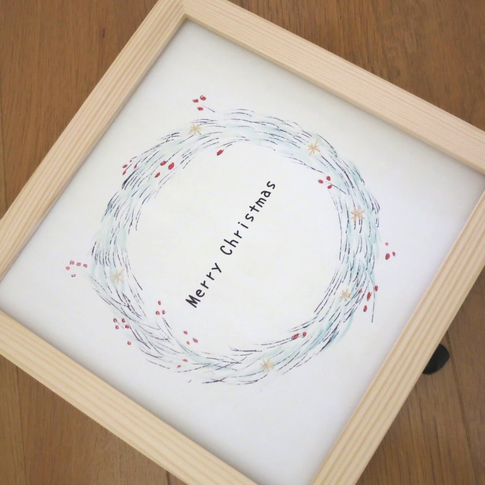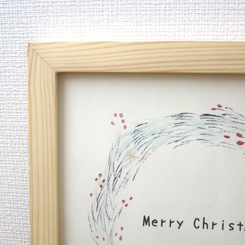 やわらかなオフホワイトの背景に浮かぶ、繊細なクリスマスリースを描いた日本画原画を元にしたポスターです。