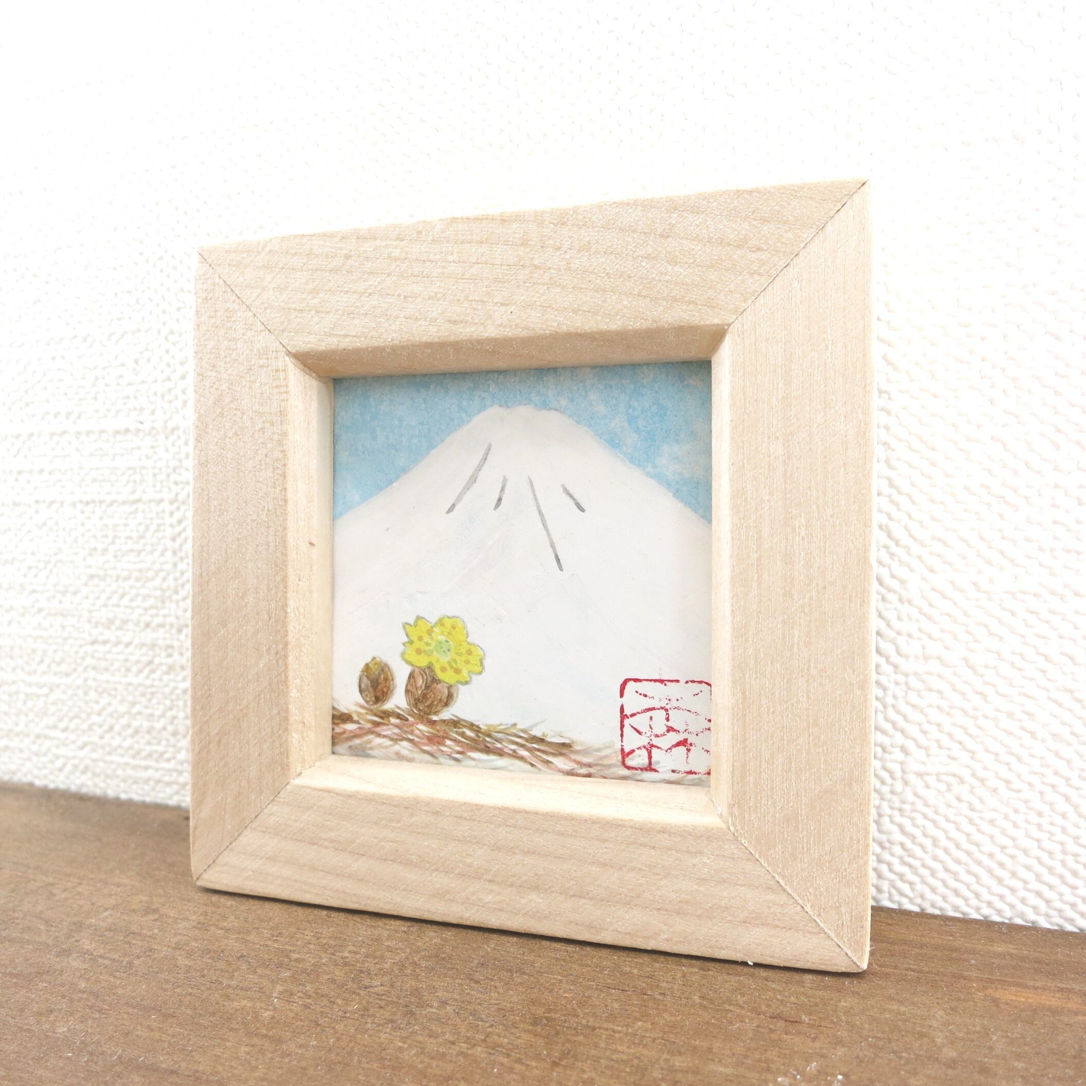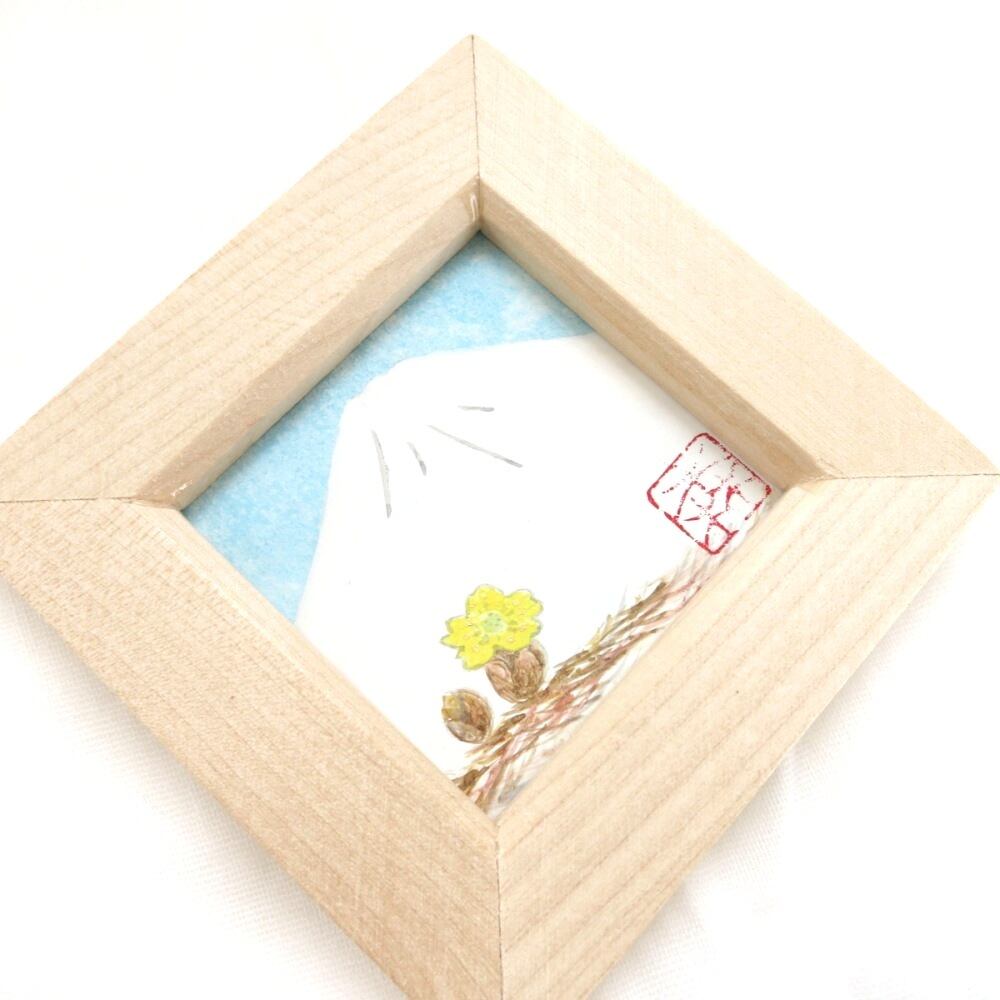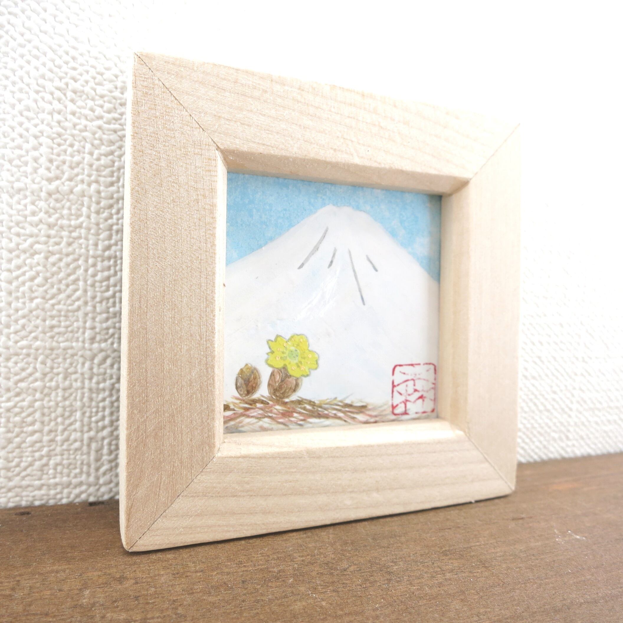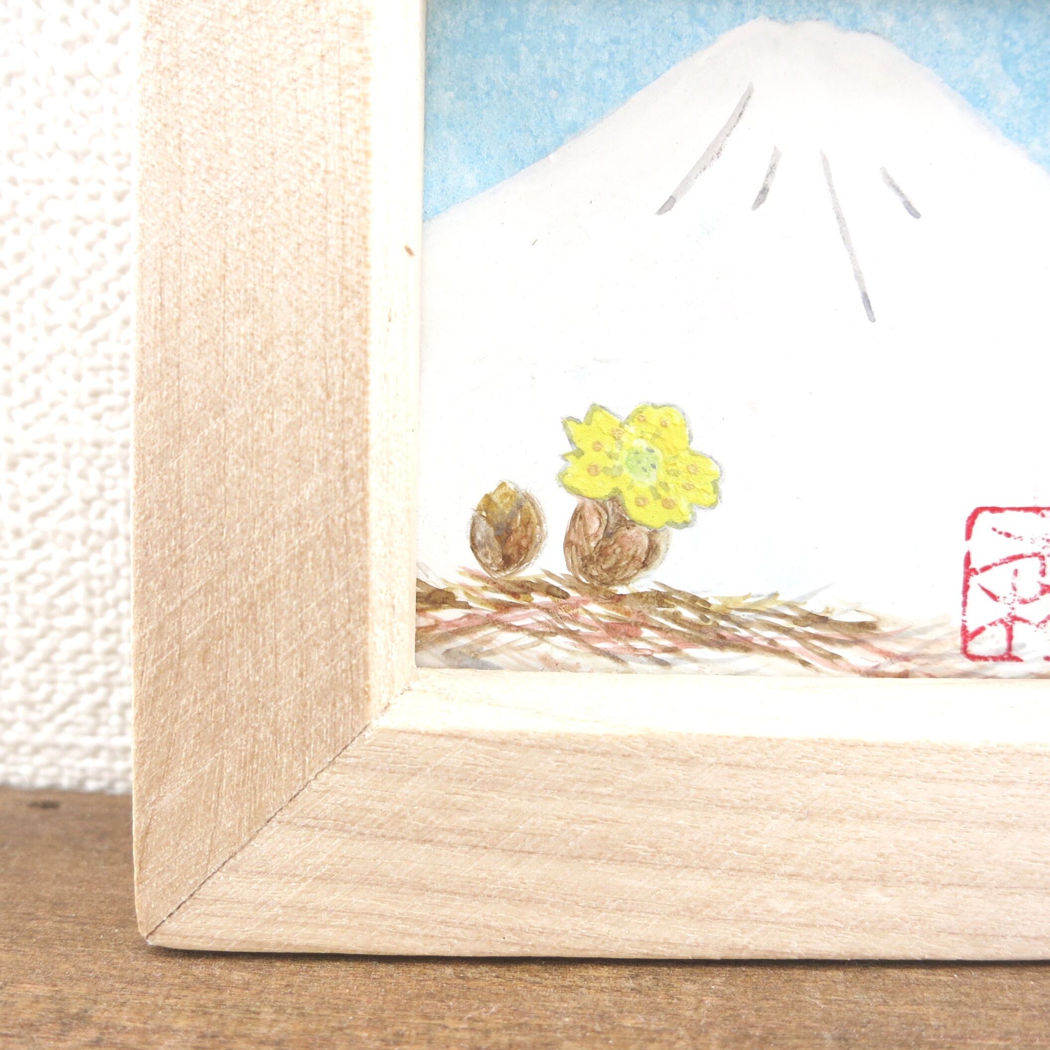 【日本画原画】白富士と福寿草(水色の空)小さな日本画原画 5.5cm角 ミニアートパネル ミニ額縁付き