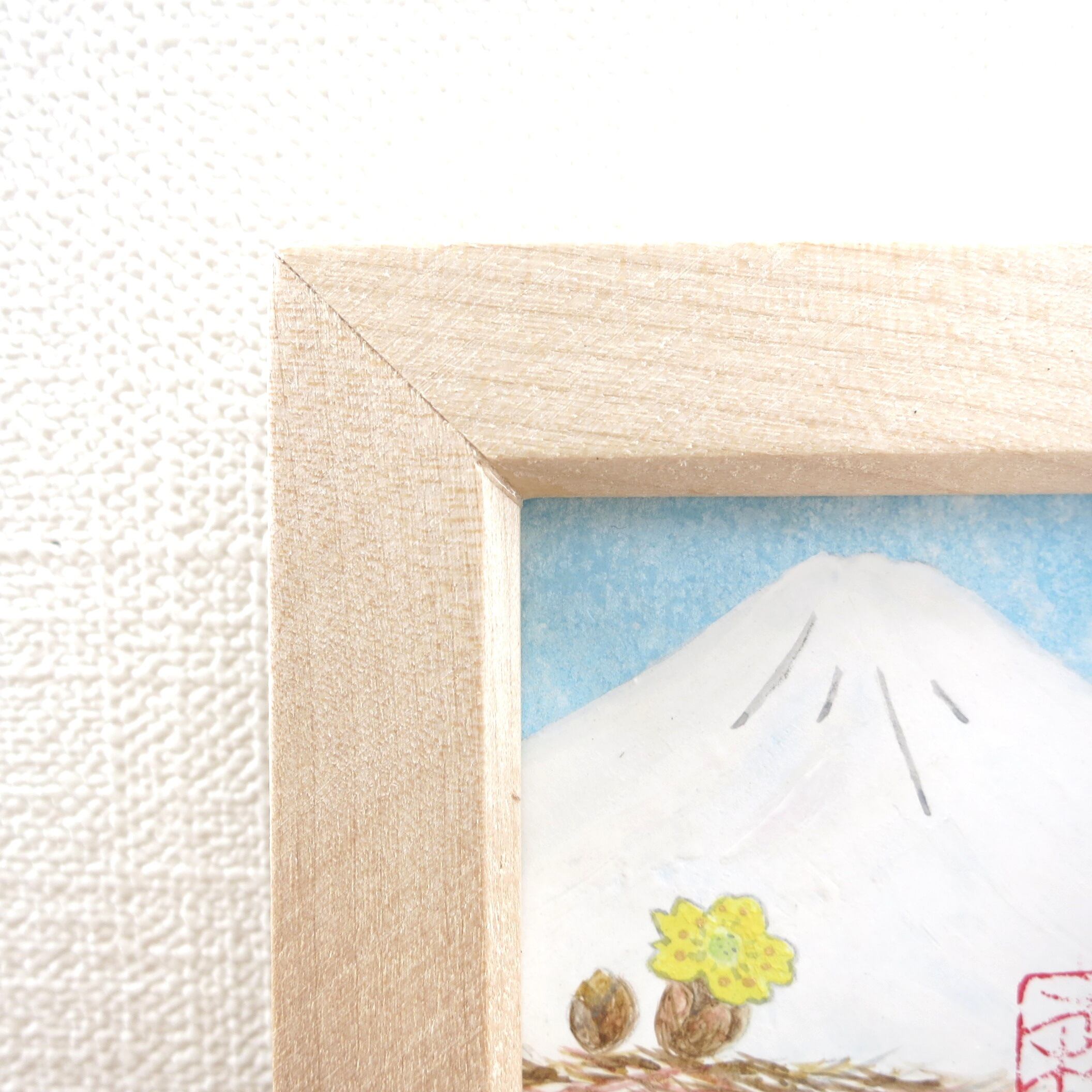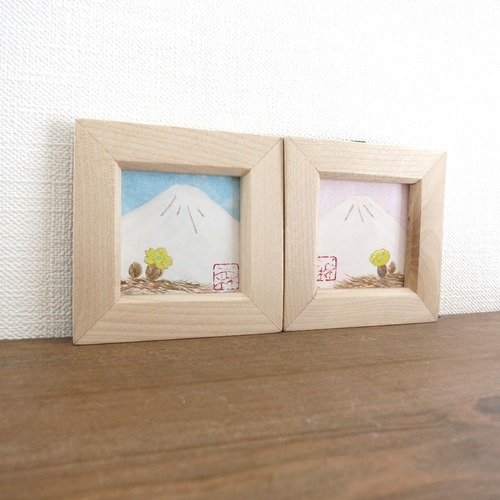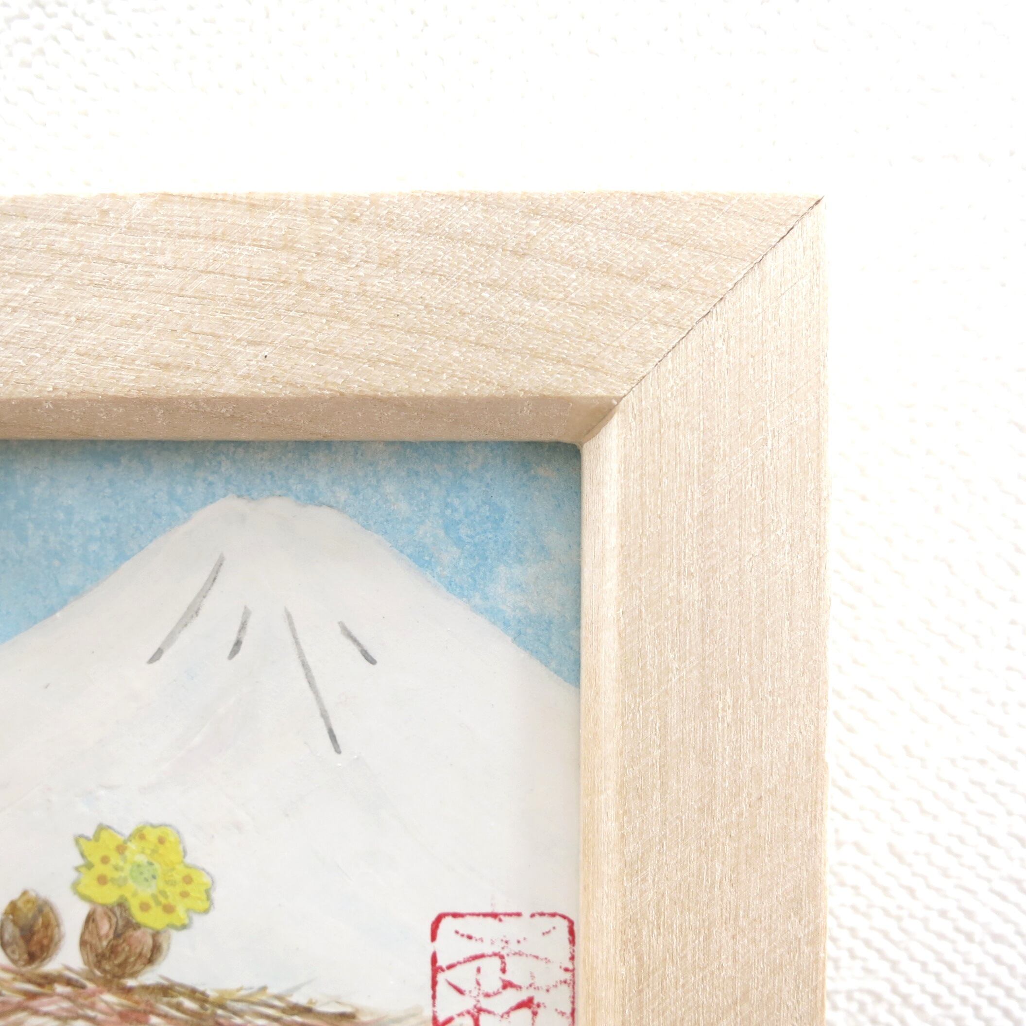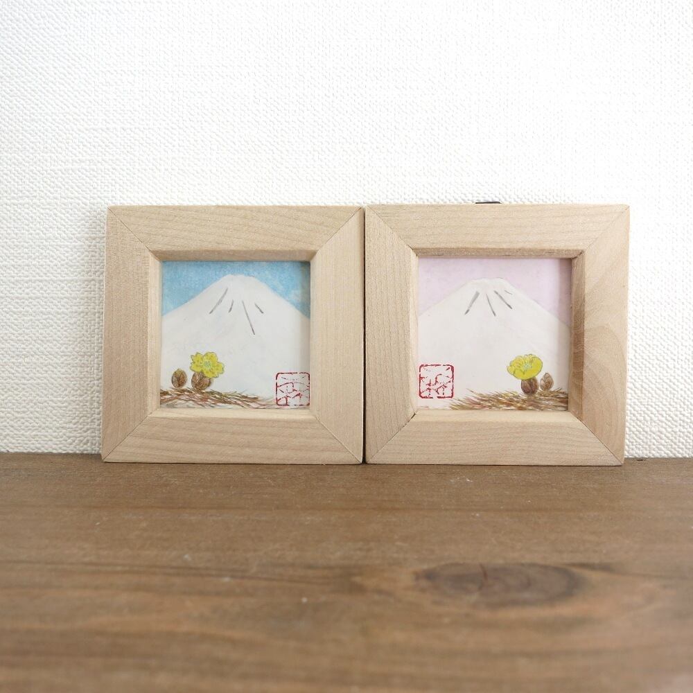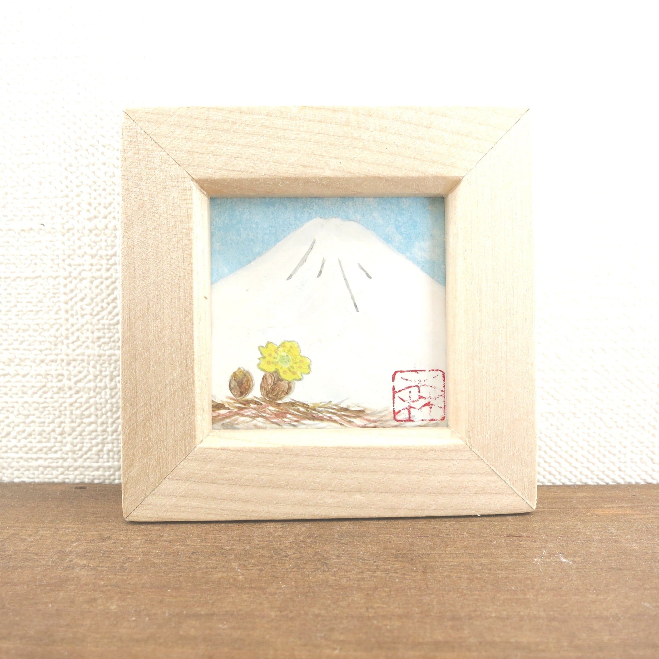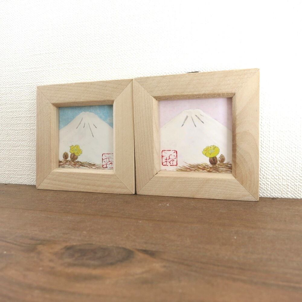 【日本画原画】白富士と福寿草(水色の空)小さな日本画原画 5.5cm角 ミニアートパネル ミニ額縁付き