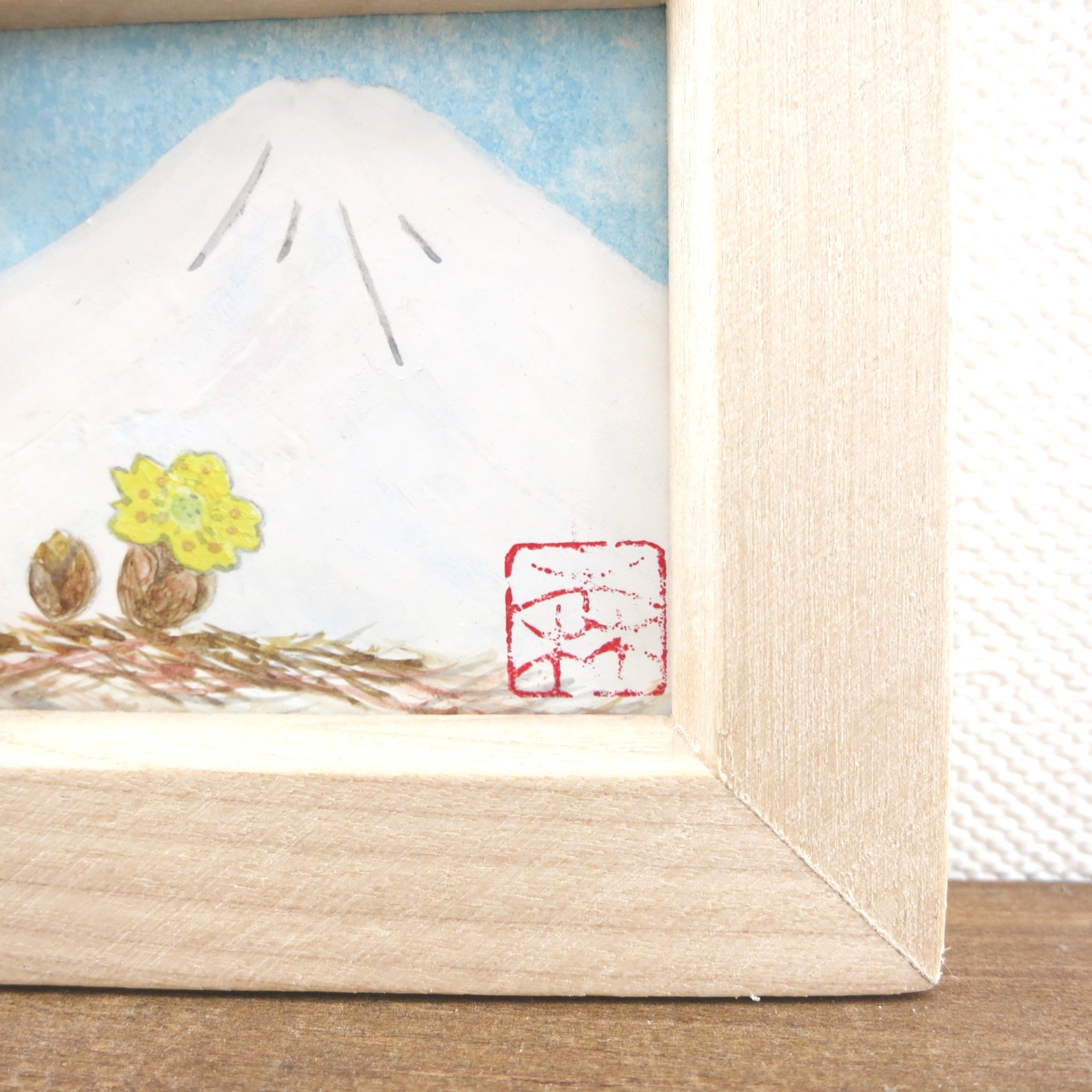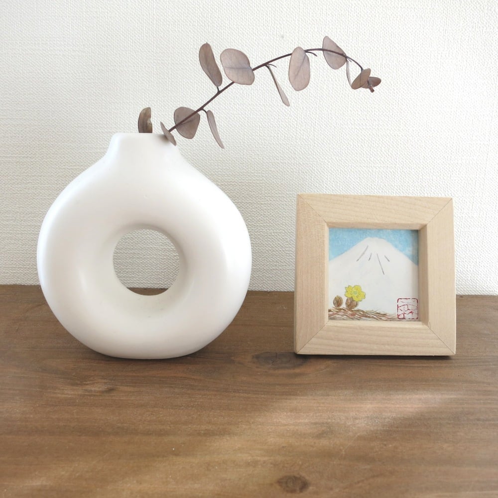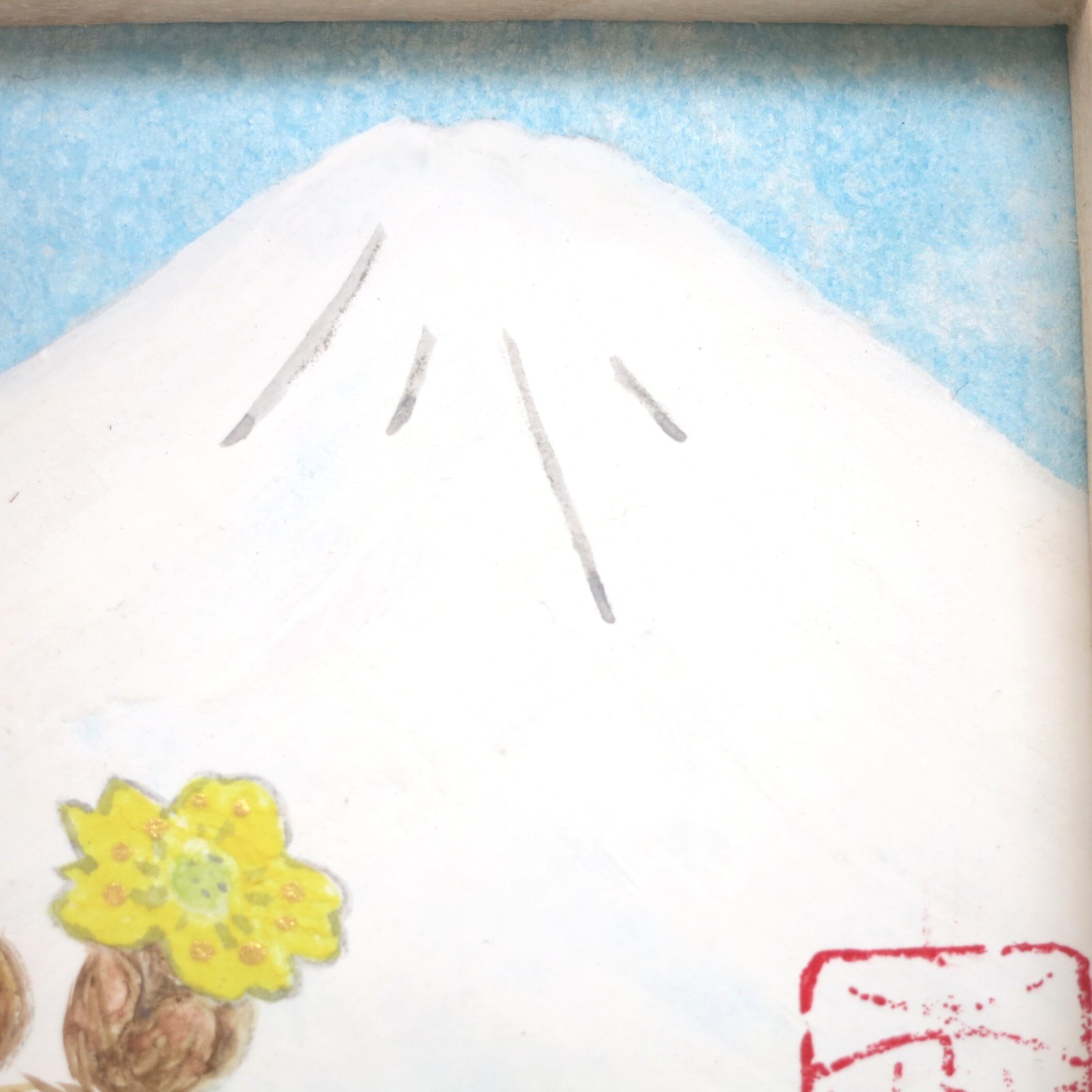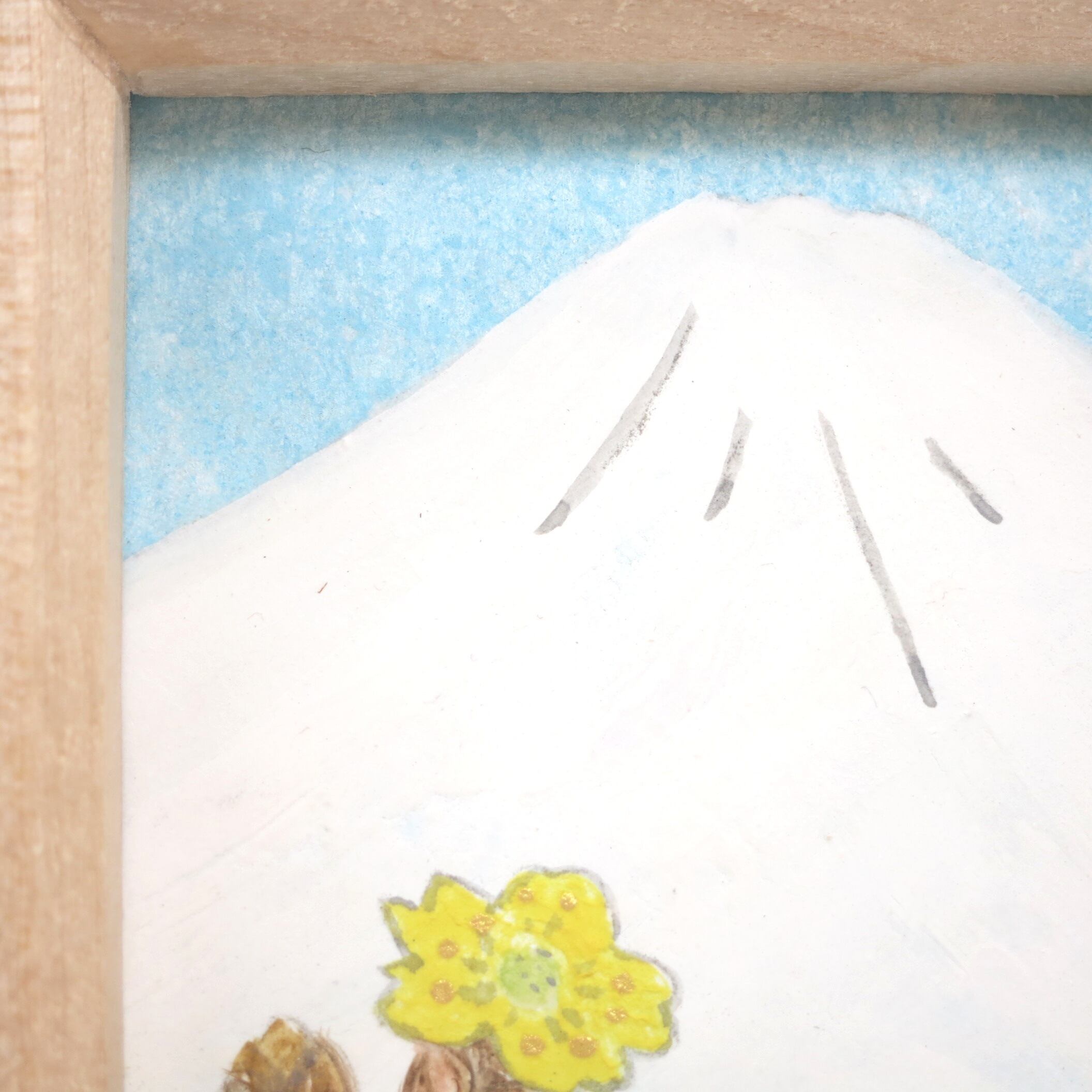 【日本画原画】白富士と福寿草(水色の空)小さな日本画原画 5.5cm角 ミニアートパネル ミニ額縁付き