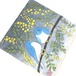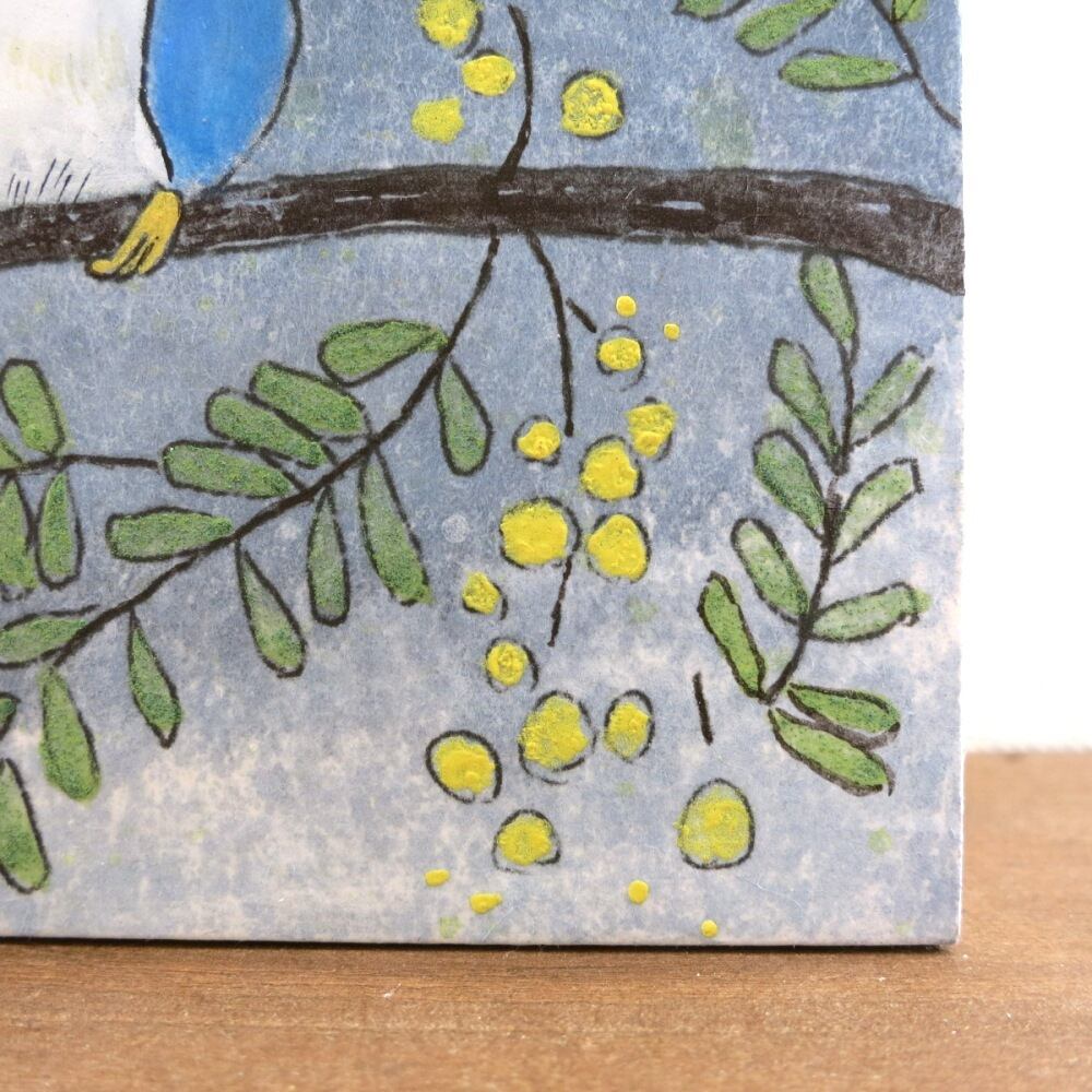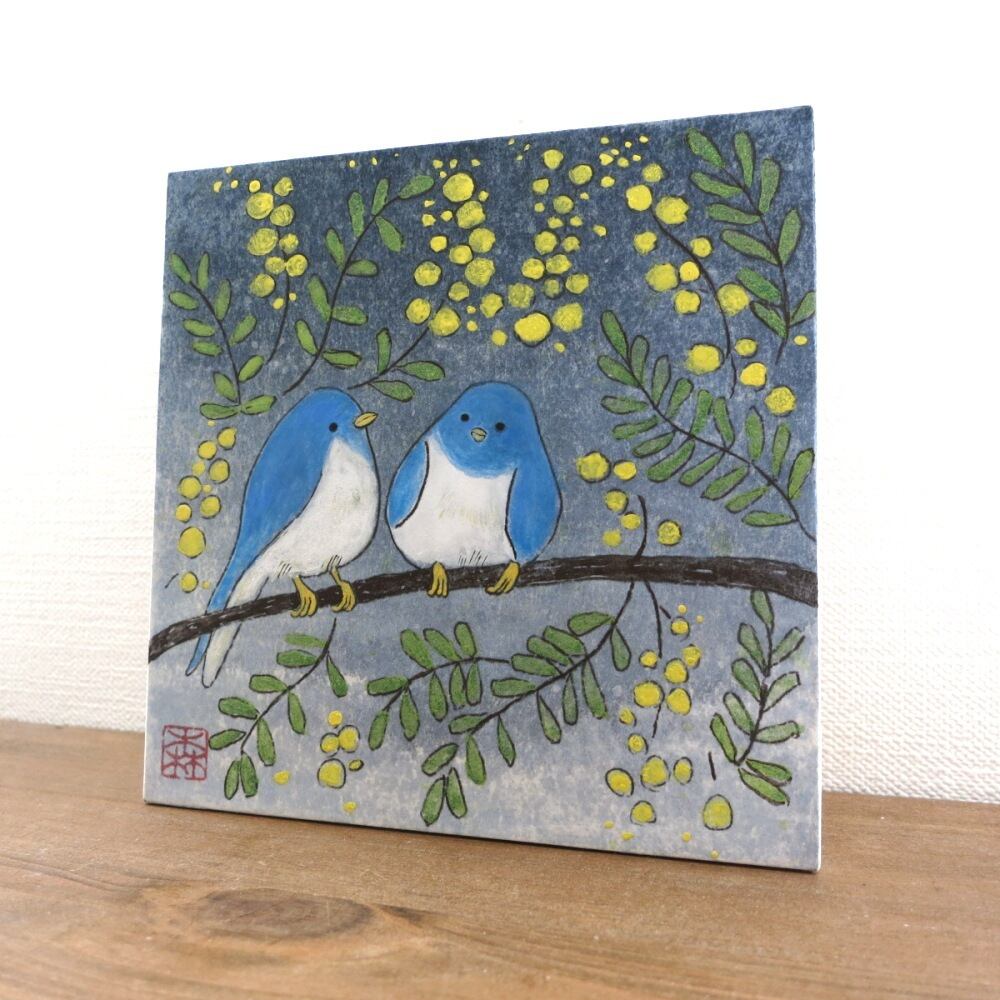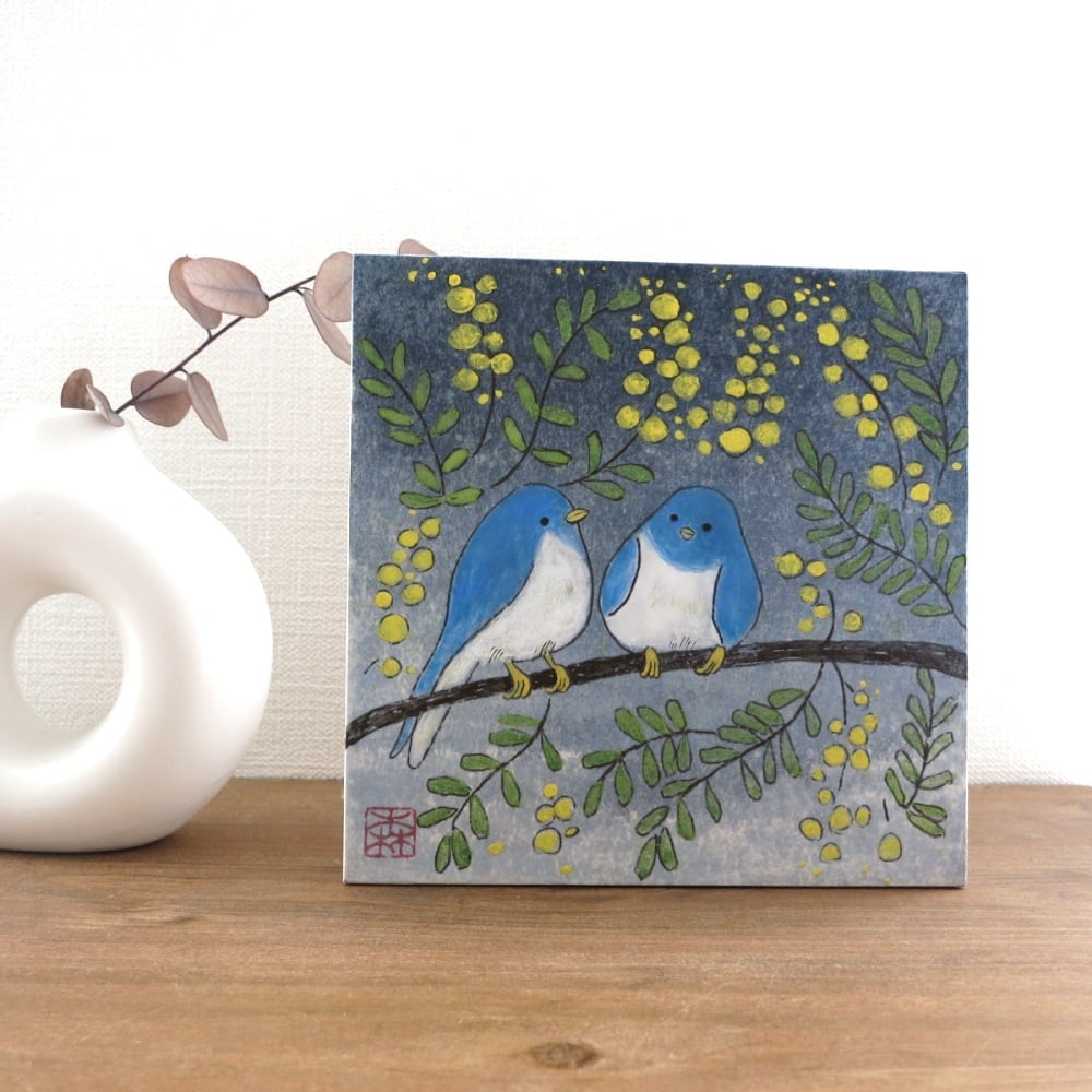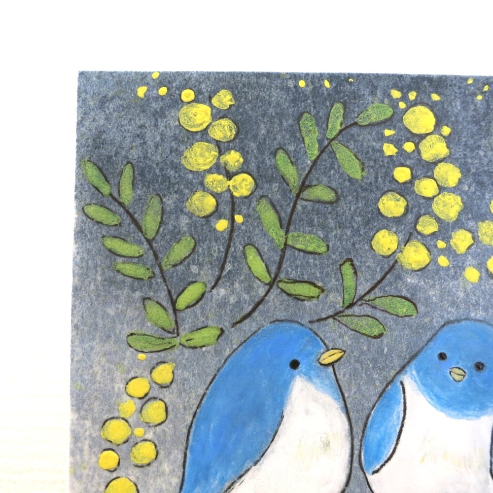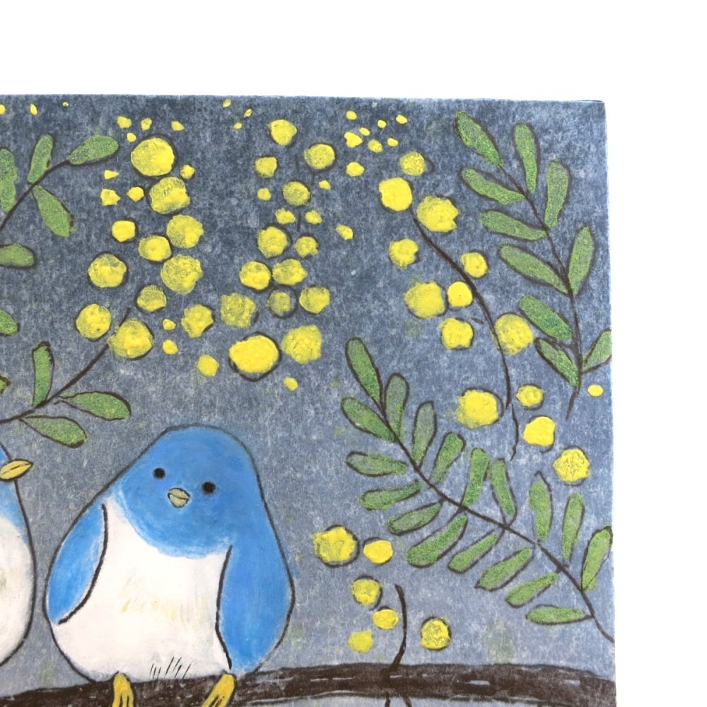 やわらかな黄色のミモザの花と、静かに寄り添う青い鳥の姿が、穏やかな時間の流れを感じさせます。