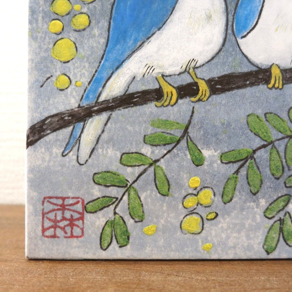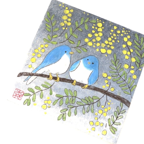 ミモザの木に、二羽の青い鳥がそっと集う情景を描いた日本画の原画作品です。