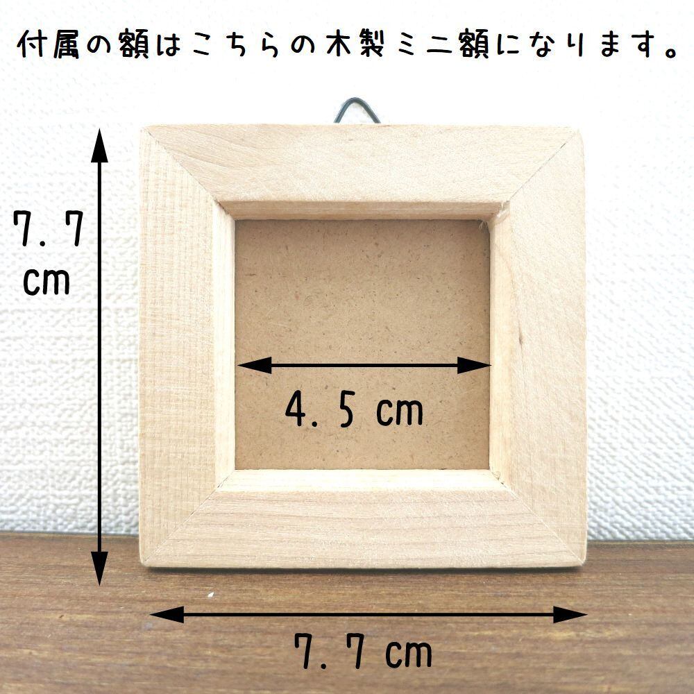 大きさは額7.7㎝×7.7㎝ 絵5.5㎝×5.5㎝ 窓枠 縦4.5㎝×4.5㎝になっています。