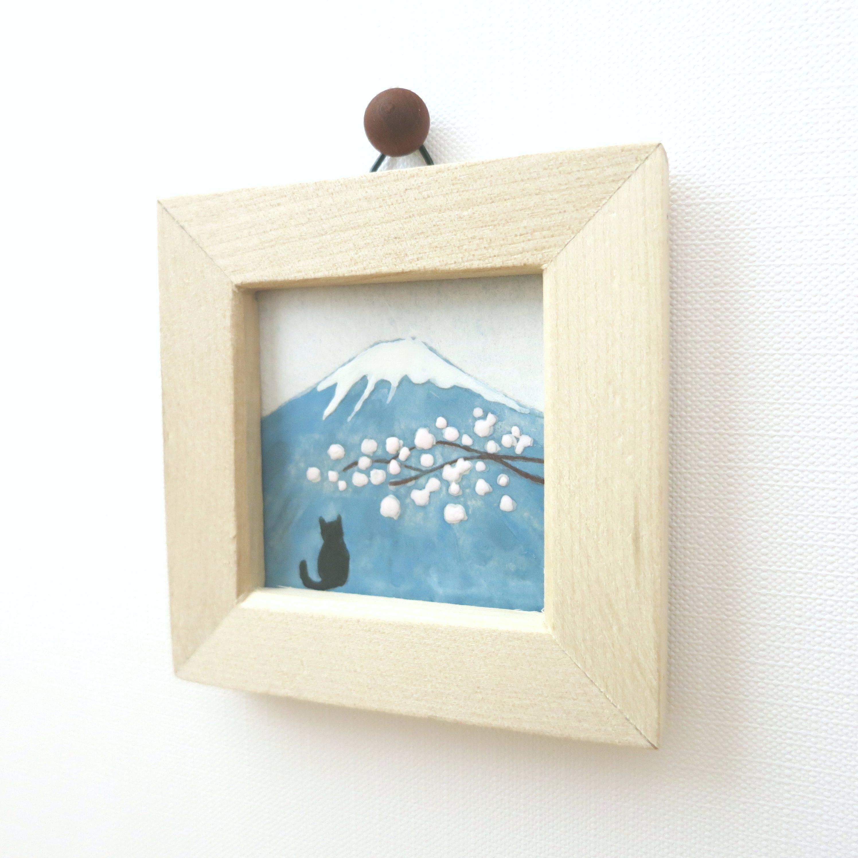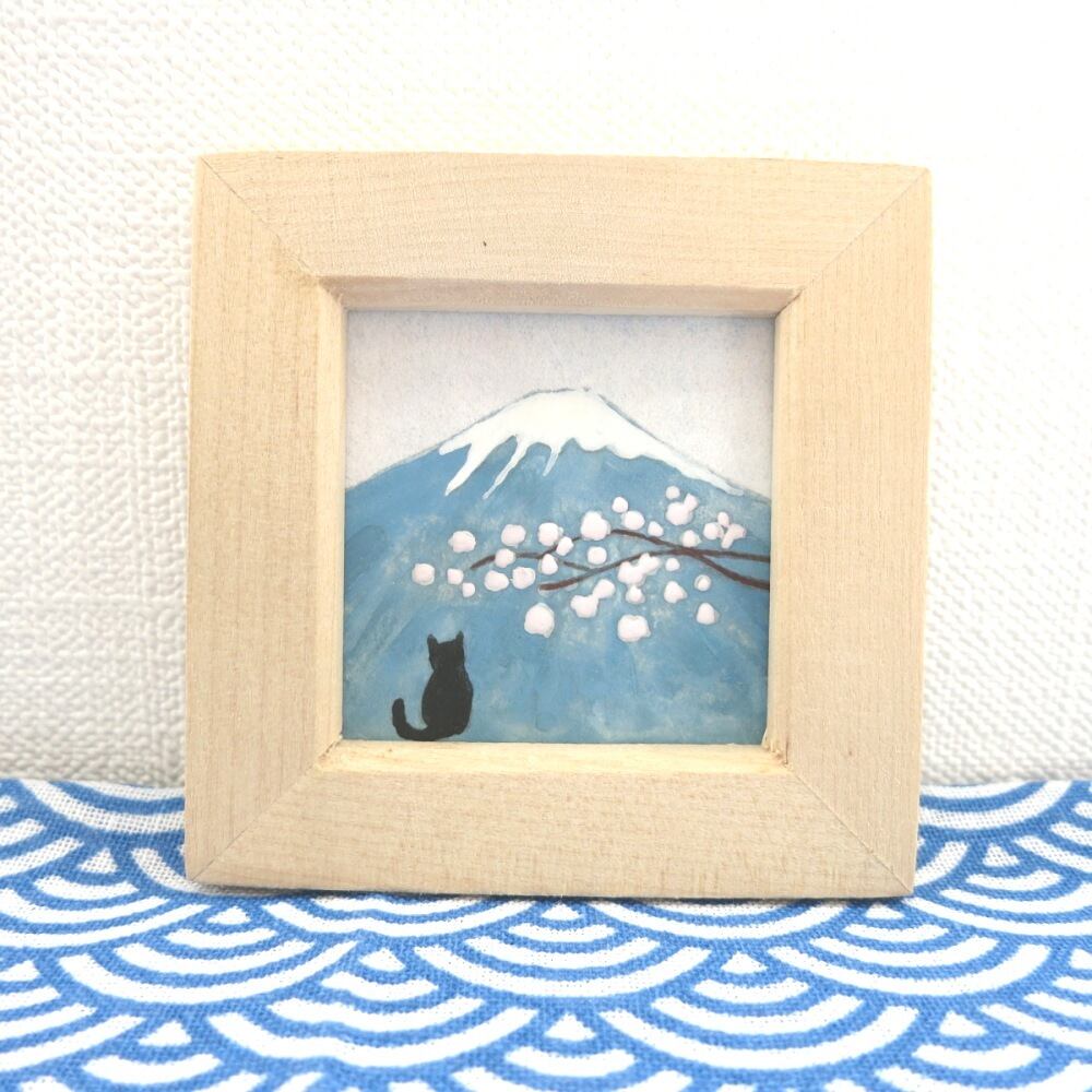 【日本画ポスター】富士山と桜と黒猫 絵画 ミニ額付き ミニアートパネル インテリアアート