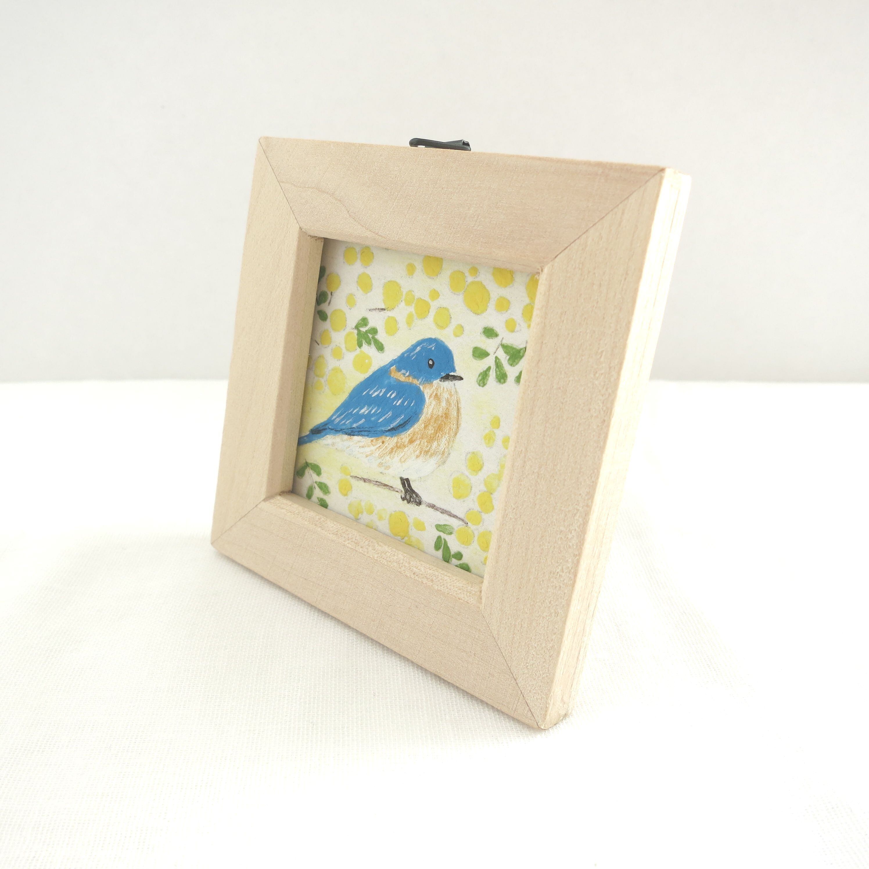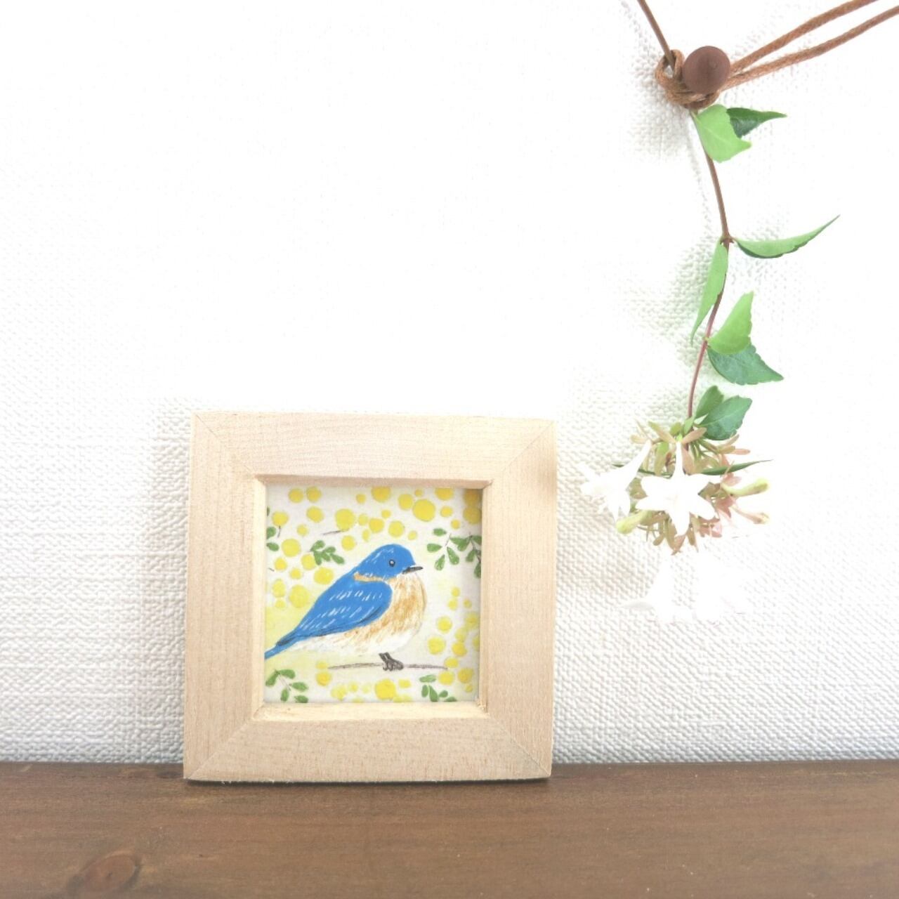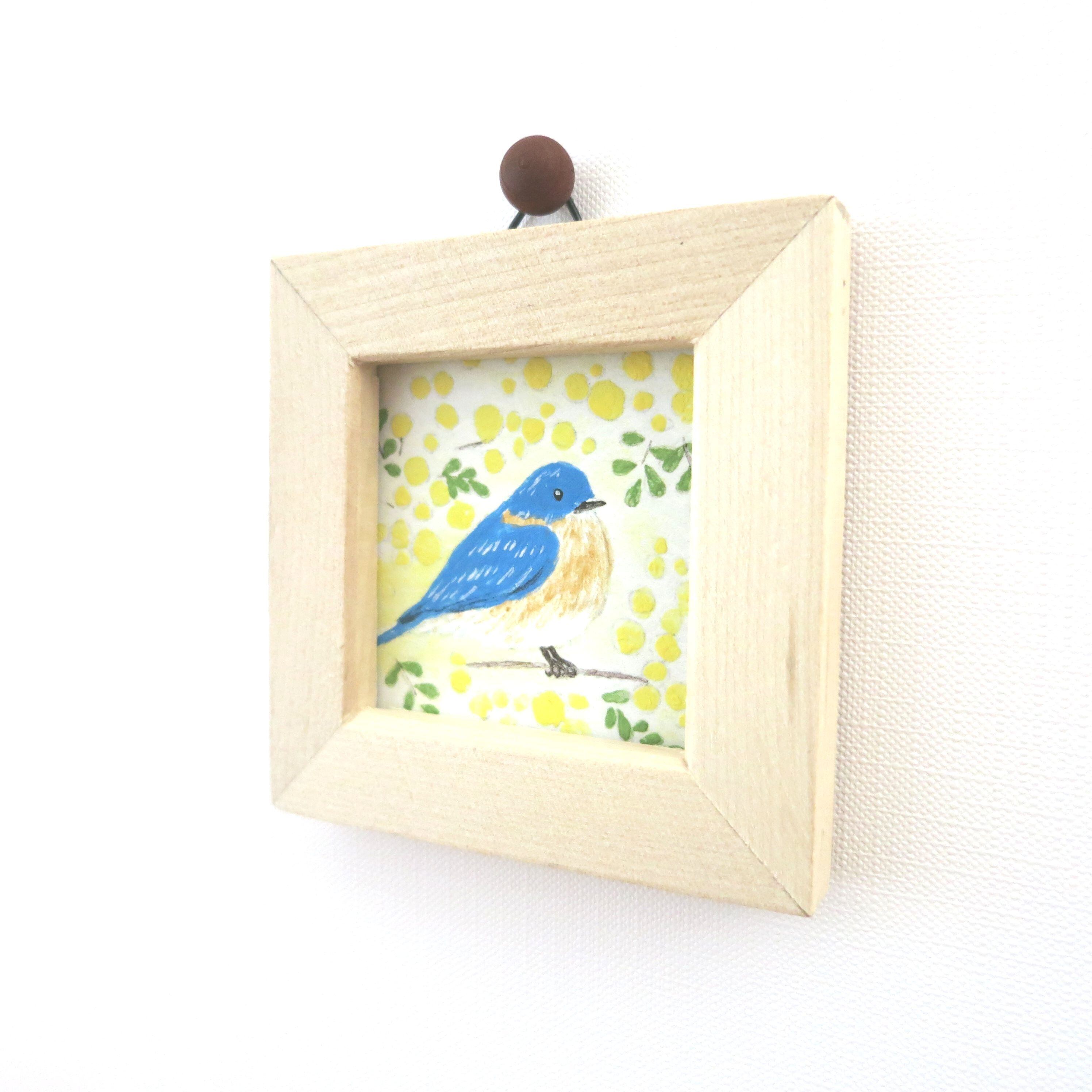 【日本画ポスター】春を告げるミモザと幸せの青い鳥 絵画 ミニ額付き ミニアートパネル インテリアアート