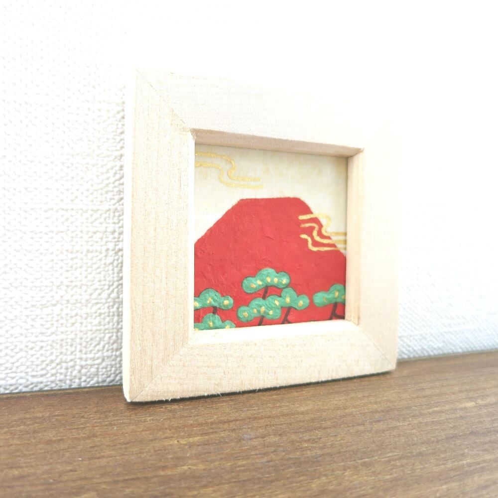 【日本画原画】赤富士と松林と黄金の風 絵画 ミニ額付き ミニアートパネル インテリアアート