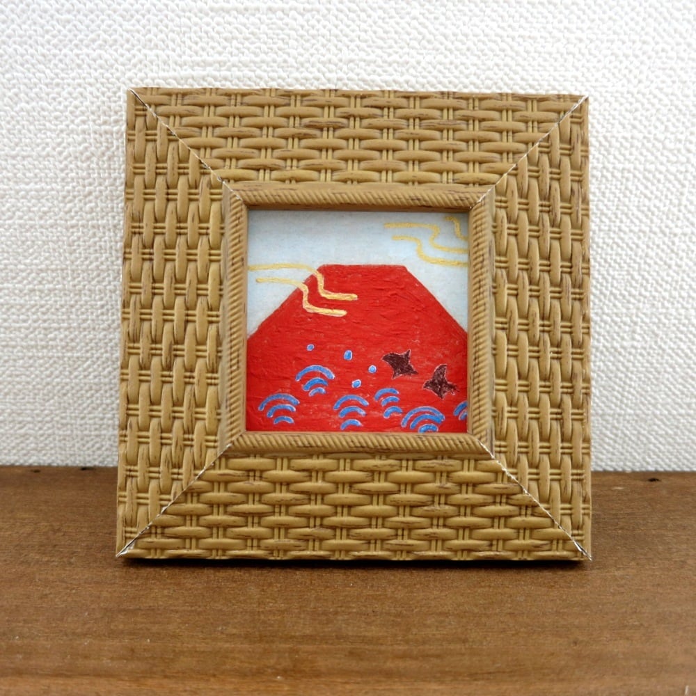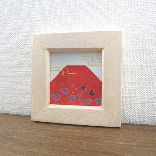 【日本画原画】赤富士と千鳥と黄金の風 絵画 ミニ額付き ミニアートパネル インテリアアート