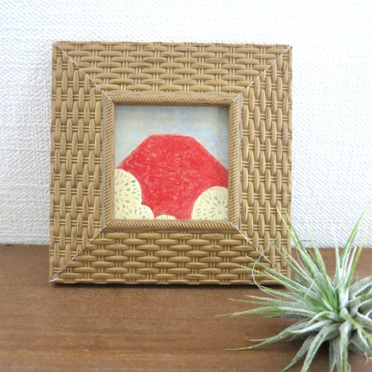 【日本画原画】赤富士と満開の菊 絵画 ミニ額付き ミニアートパネル インテリアアート