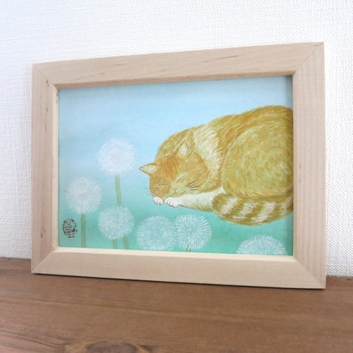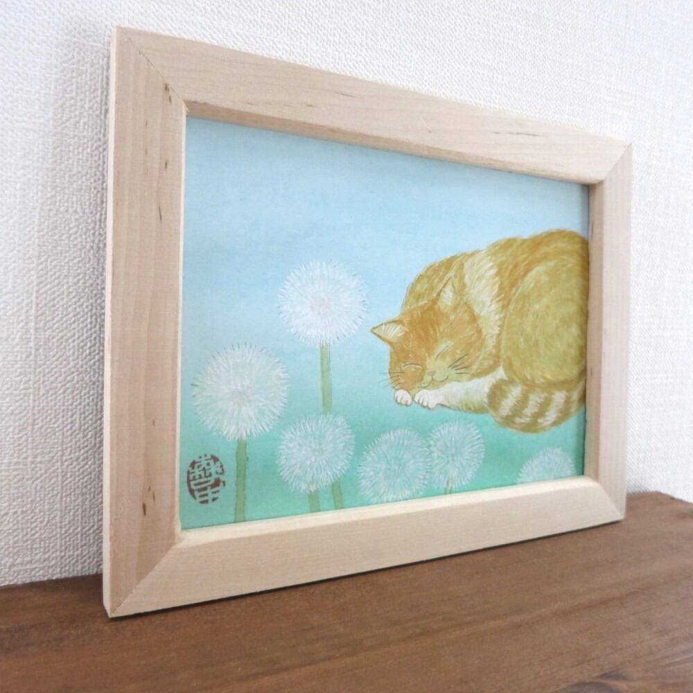 日本画 原画 眠り猫とたんぽぽの綿毛 インテリア アート ミニアート パネル 絵画