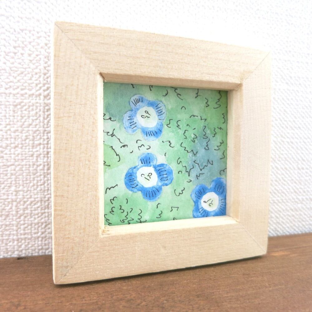 また、小さいサイズのミニ額付きで、お手軽にお部屋のポイントとして設置できます。絵画に用いられたオオイヌフグリの花言葉は、『信頼』『忠実』『清らか』という素敵な意味が込められています。自分へのご褒美や、大切な人へのプレゼントにもお勧めです。