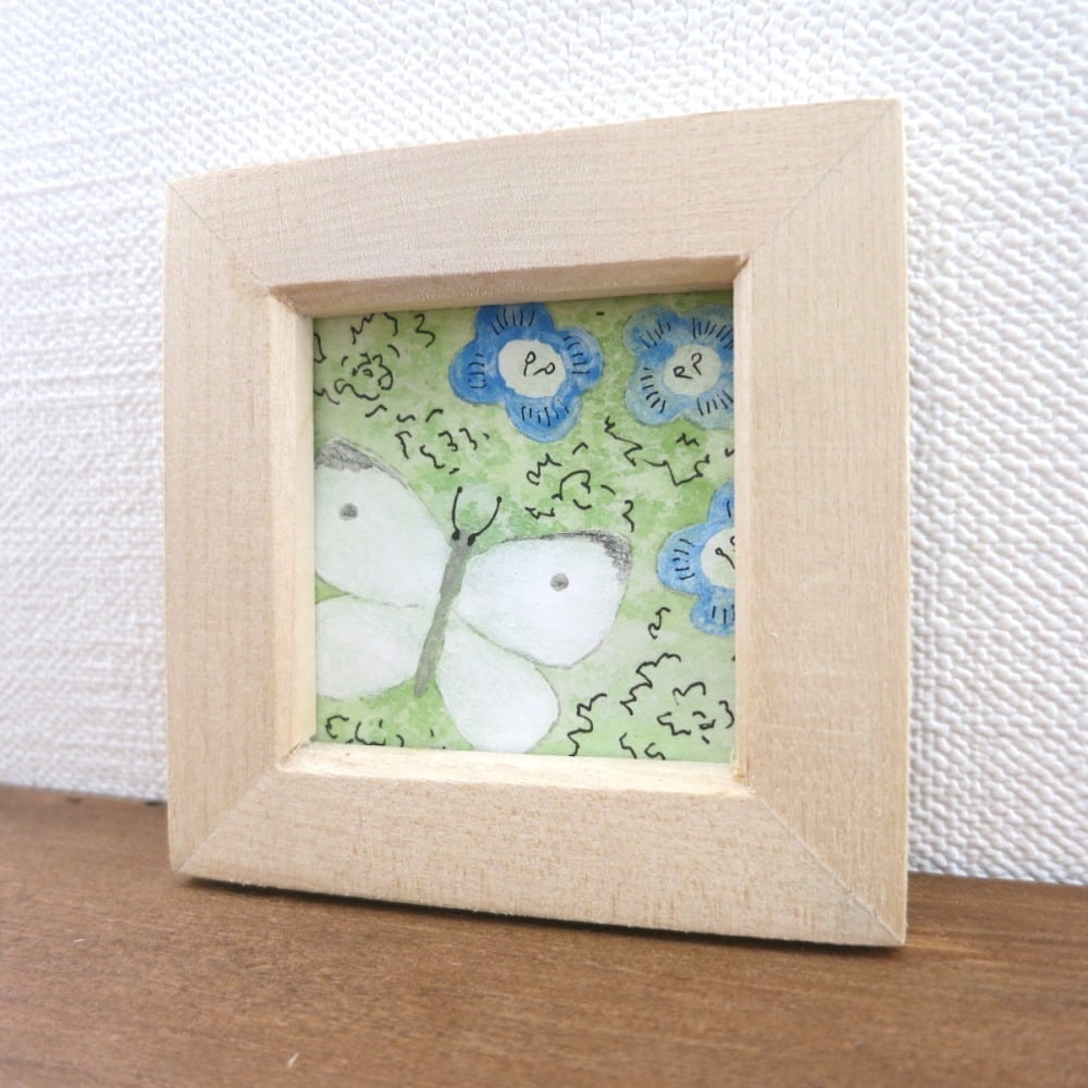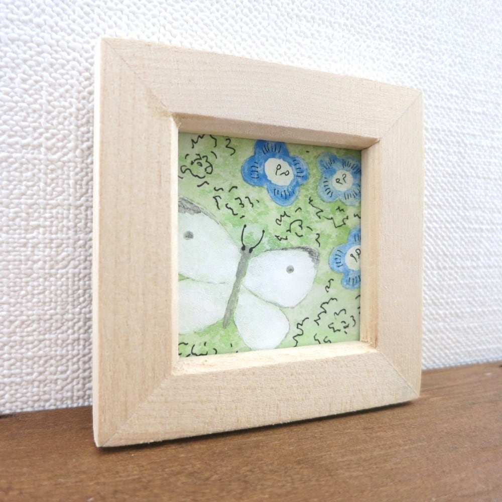 【日本画原画】オオイヌフグリとモンシロチョウ① 絵画 ミニ額付き ミニアートパネル インテリアアート