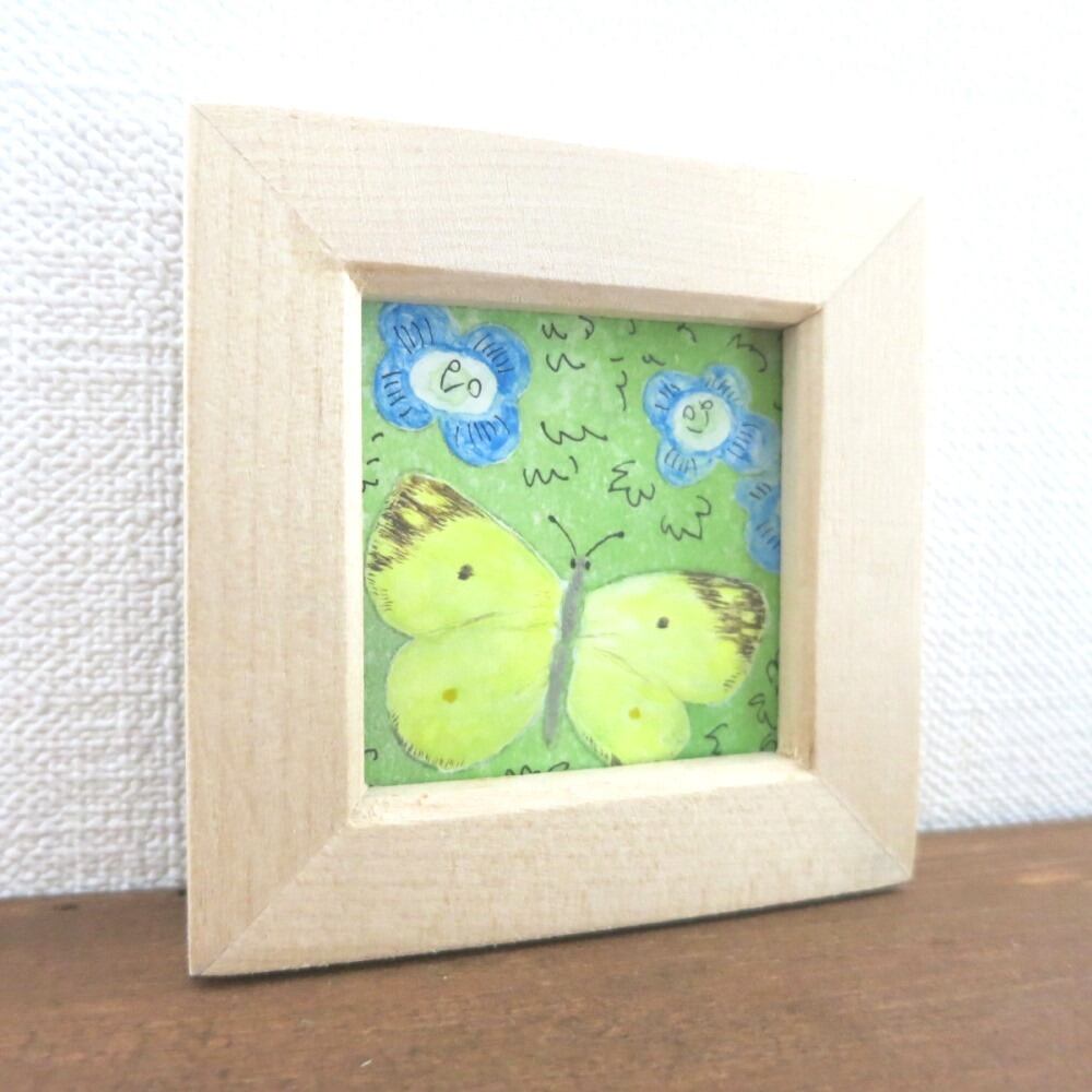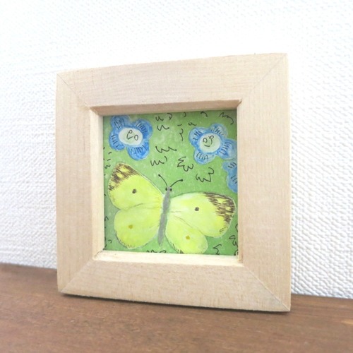 【日本画原画】オオイヌフグリとモンキチョウ① 絵画 ミニ額付き ミニアートパネル インテリアアート