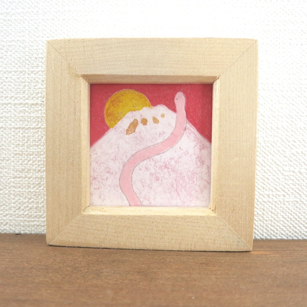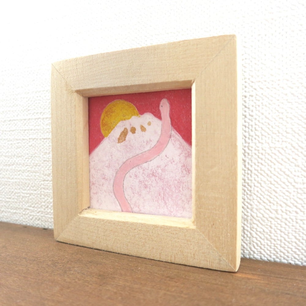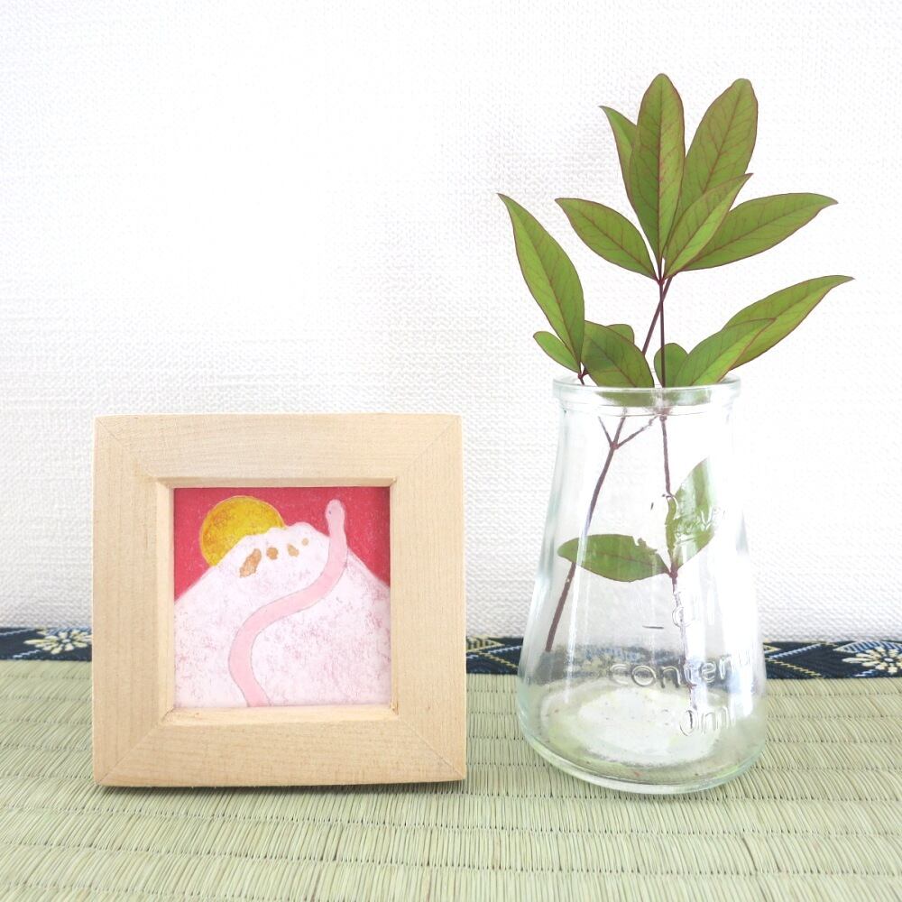 【日本画原画】初日の出とピンク蛇と白富士⑫カレンダーのおまけ付き ミニ額縁付き ミニアートパネル インテリアアート